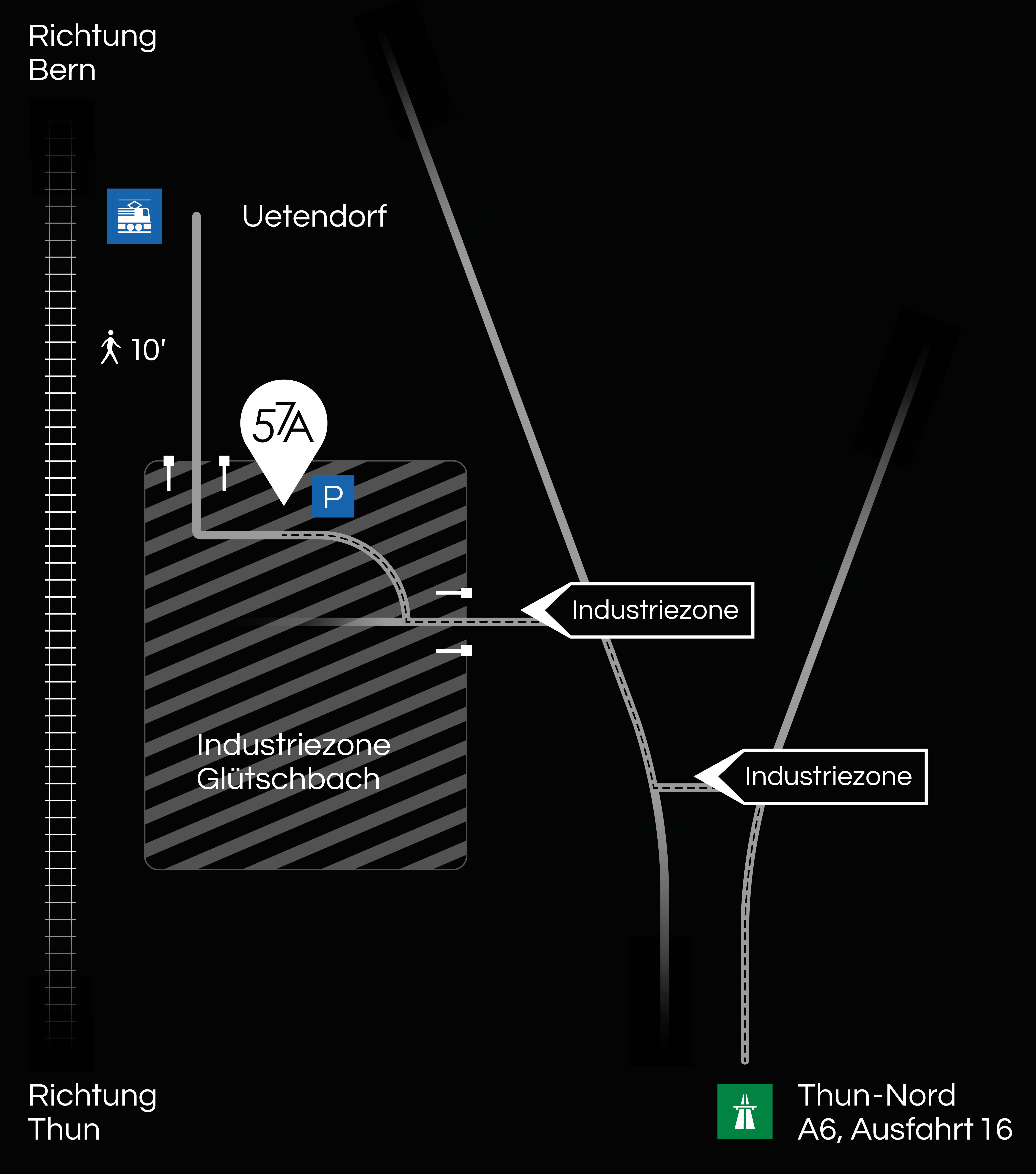 Verlasse den Bahnhof Uetendorf über den «Hinterausgang». Geh dann den Gleisen entlang, bis du durch das grosse Tor das Glütschbach-Areal betrittst. Biege anschliessend links in die erste Strasse ein. Noch ein paar Schritte und unser Büro befindet sich auf der linken Seite im zweiten OG. Wir freuen uns auf dich!